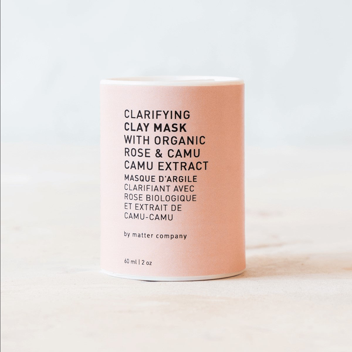 Clarifying Clay Mask (60 ml / 2 oz) A mineral-rich blend of rhassoul and multani mitti clays, with neem, rose petals, and camu camu to detoxify and gently refine skin.